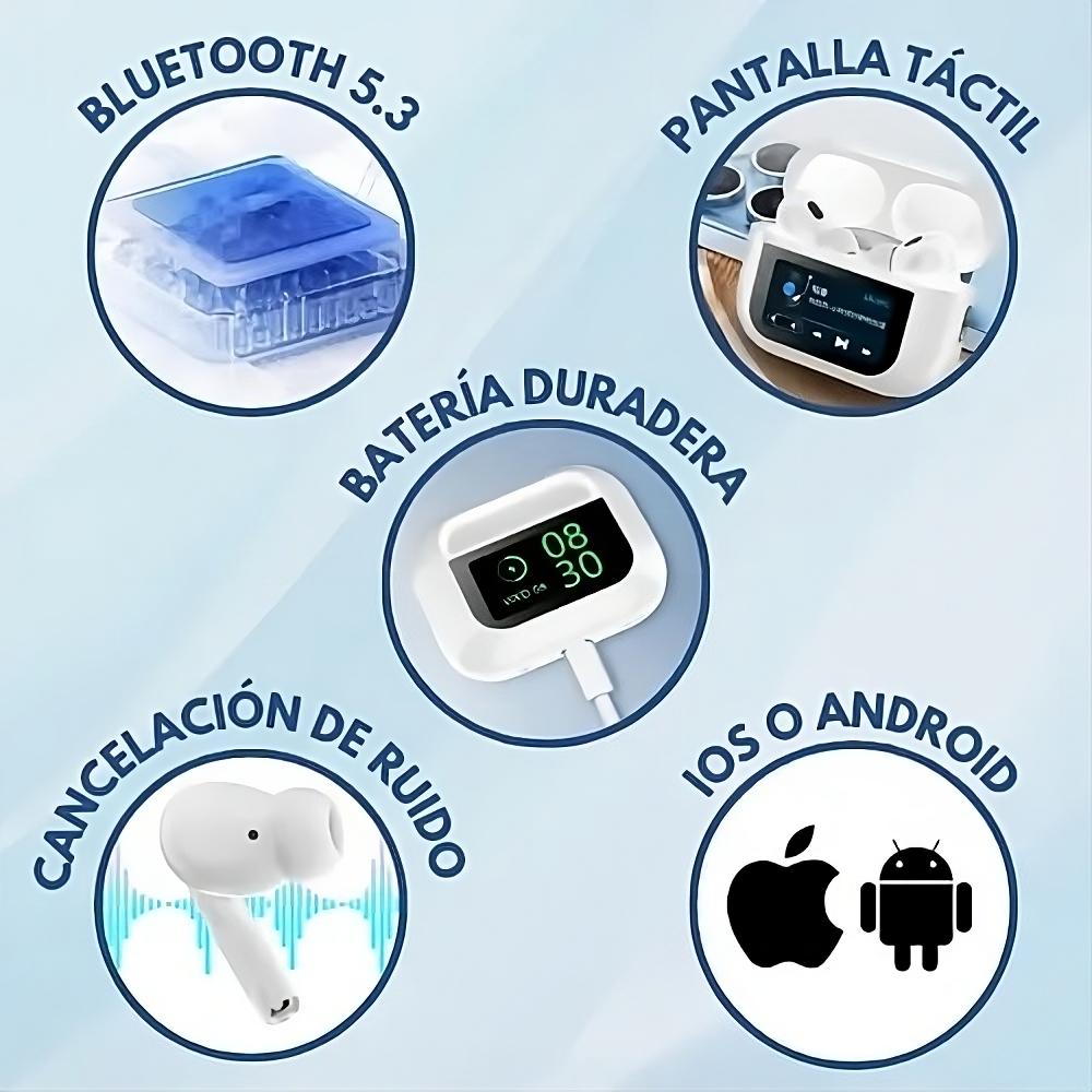 2. Pantalla Táctil Inteligente LED: Control total desde la pantalla de los auriculares, incluyendo volumen, música, fondos de pantalla, y más.